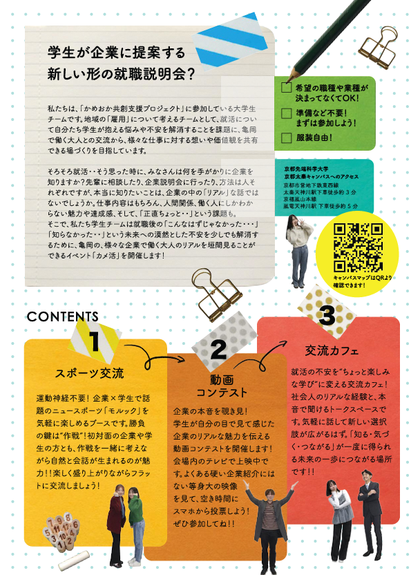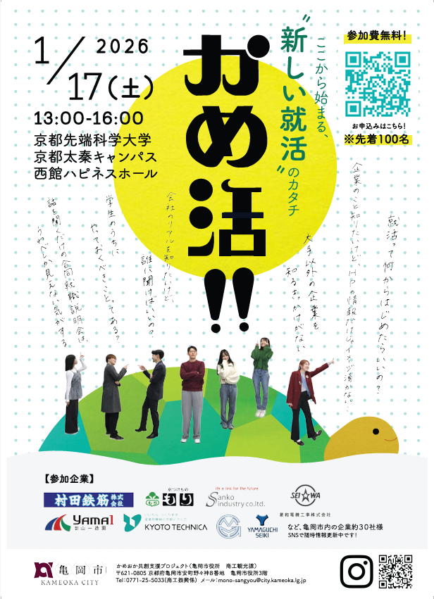 学生交流イベント「亀岡de就活!カメ活」に参加します|京都・亀岡で採用を行う亀岡電子 このたび、京都府亀岡市に本社を置く亀岡電子株式会社は、2026年1月17日(土)に開催される学生向けコミュニケーションイベント「亀岡de就活!カメ活」 に参加します。 「カメ活」は、就職活動への不安や疑問を抱える大学生が自ら企画した、学生と企業がフラットに交流できる新しいスタイルの就活イベントです。 当日は、モルック体験や交流カフェなどのプログラムを通じて、企業説明会では伝わりにくい仕事のやりがいや職場の雰囲気、京都・亀岡で働くリアルについて、学生の皆さんと直接お話しできる機会となっています。 亀岡電子では、京都・亀岡エリアでのものづくりに関心のある学生の皆さんと直接お会いできることを楽しみにしています。 日時:2026年1月17日(土)13:00〜16:00場所:京都先端科学大学 太秦キャンパス ▼主催:亀岡市役所 かめおか共創支援プロジェクトhttps://www.city.kameoka.kyoto.jp/soshiki/29/72540.html 亀岡電子でのキャリアに興味がある方へ当社では、京都・亀岡エリアでのものづくりに熱意を持ち、チームとともに成長したい方を募集しています。詳しい募集要項・会社の雰囲気・選考フローは、以下の採用ページをご覧ください👇 採用情報(エンゲージ)https://en-gage.net/kameoka-electronics/