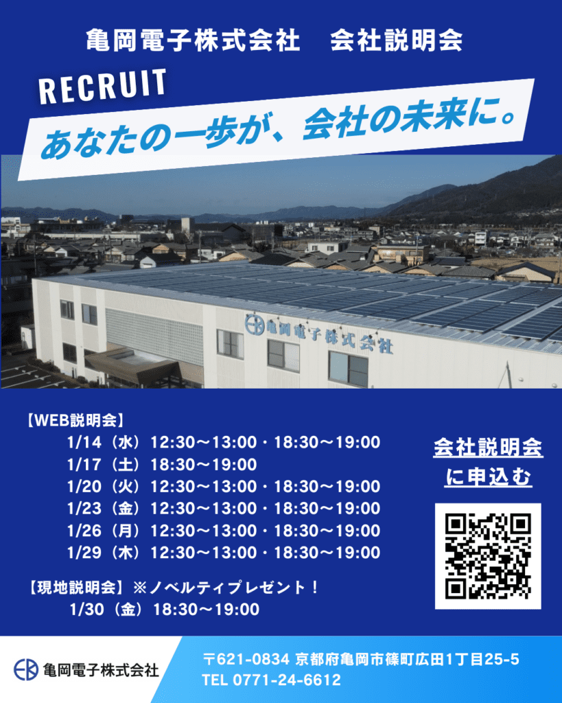 WEB会社説明会開催のお知らせ|京都・亀岡のセンサメーカー「亀岡電子」 亀岡電子株式会社では、学生・求職者の皆さまを対象に WEB会社説明会を開催いたします。 当社は京都府亀岡市に本社を構える、創業43年のセンサメーカーです。 会社概要や事業内容、仕事内容、働く環境について、30分で分かりやすくご紹介します。 「製造業に興味がある」「京都・亀岡で働きたい」「まずは話を聞いてみたい」 そんな方も大歓迎です。ぜひお気軽にご参加ください。 ■ WEB会社説明会(オンライン) 1/14(水)12:30〜13:00/18:30〜19:00 1/17(土)18:30〜19:00 1/20(火)12:30〜13:00/18:30〜19:00 1/23(金)12:30〜13:00/18:30〜19:00 1/26(月)12:30〜13:00/18:30〜19:00 1/29(木)12:30〜13:00/18:30〜19:00 ■ 現地(リアル)会社説明会 1/30(金)18:30〜19:00 ※ご参加の方にはノベルティプレゼントあり! ■ お申込み方法 以下のGoogleフォームよりお申込みください。 https://forms.gle/oSPv5p1ecgsu6WDw5 ※各回定員がございます。ぜひお早めにお申込みください!
