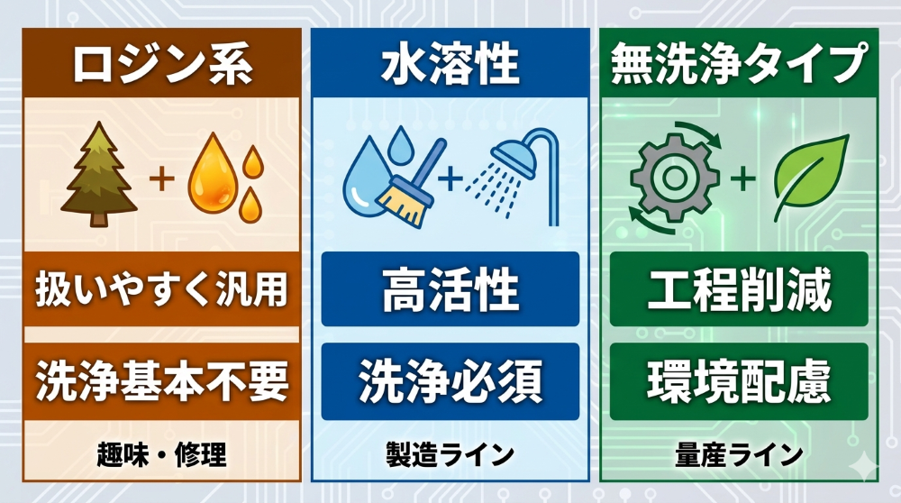 3種類のフラックスは「ロジン系=扱いやすく汎用的」「水溶性=高性能だが洗浄必須」「無洗浄=工程短縮・環境配慮」と整理できます。選択基準は「使用場所」と「洗浄環境の有無」がポイントです。趣味・試作ならロジン系RMA、製造ラインで洗浄設備があるなら水溶性、工程削減優先なら無洗浄タイプが基本選択肢。なお、頑固な残渣除去には専用の「フラックスリムーバー」が効果的です。用途に応じた使い分けが成功の鍵となります。